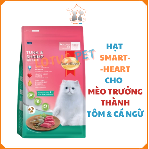 Bạn muốn mèo cưng thưởng thức bữa ăn giàu dinh dưỡng và ngon miệng mỗi ngày? Khám phá ngay dòng thức ăn hạt SmartHeart dành cho mèo trưởng thành từ 1 tuổi trở lên có hương vị cá ngừ & tôm độc đáo. Sản phẩm đạt chuẩn AAFCO, với công thức gấp 3 lần DHA giúp phát triển trí não. Đồng thời, bổ sung các dưỡng chất thiết yếu như chất Đạm, Omega 3, các Vitamin và chất chống oxy hóa giúp phát triển cơ bắp, nuôi dưỡng da lông, tốt cho tiêu hóa và bảo vệ tim mạch, cũng như duy trì sức khỏe toàn diện cho mèo trưởng thành.